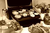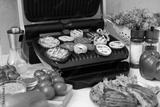 Electric grill with vegetables, mushrooms, tasty meat and spices on table, closeup