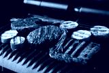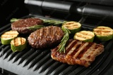 Electric grill with beef steaks, zucchini and rosemary on black table, closeup