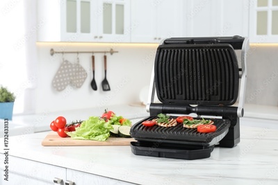 Electric grill with tasty meat and tomatoes on white marble table in kitchen