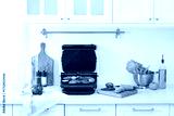 Electric grill with tasty meat and vegetables on white marble table in kitchen