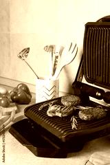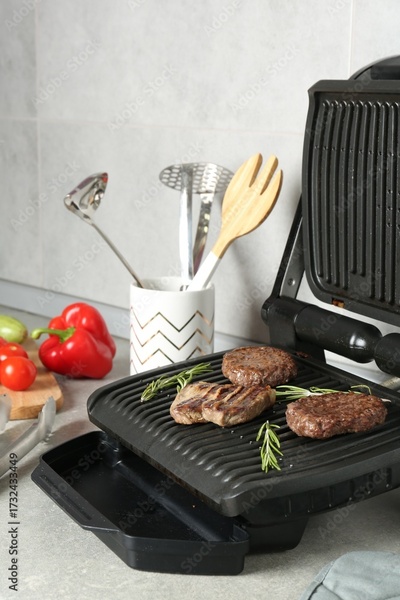 Open electric grill with beef steak, cutlets and rosemary, vegetables and cookware on light grey table, closeup