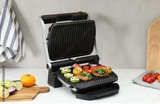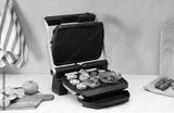 Electric grill with tasty meat and vegetables on white marble table in kitchen