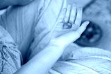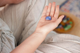 Woman with blue sodalite gemstone indoors, above view