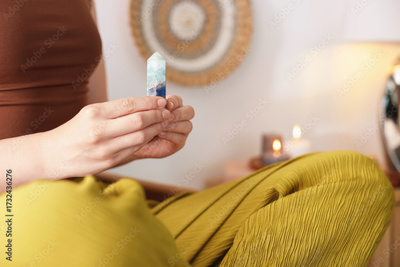 Woman with beautiful fluorite gemstone indoors, closeup. Space for text