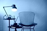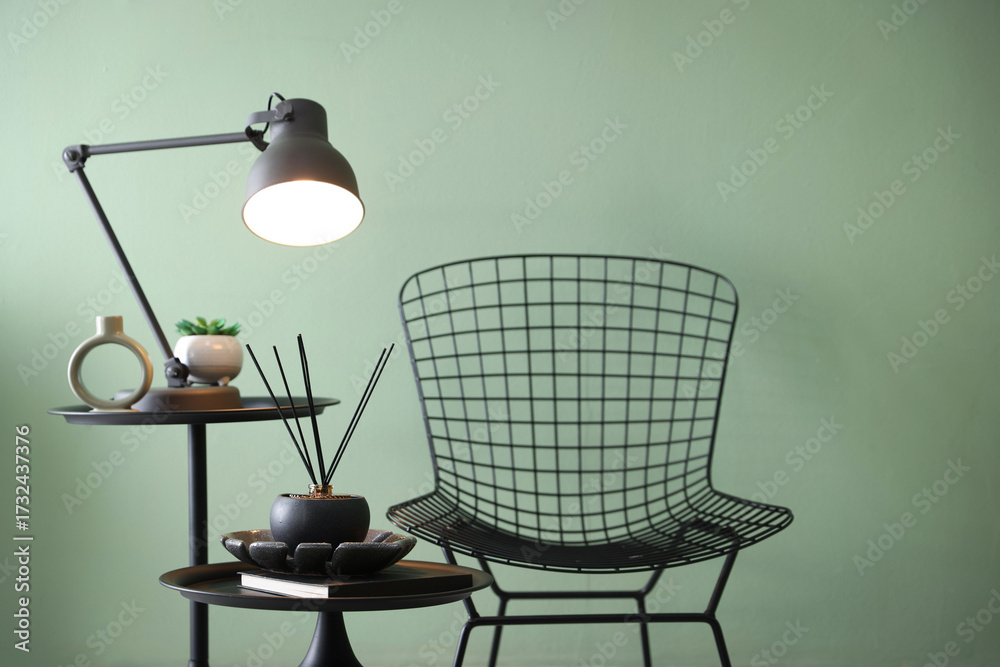 Stylish lamp, decor and reed diffuser on nesting tables near armchair against green wall indoors