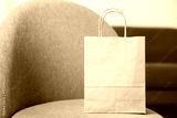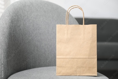 Paper bag on grey armchair indoors, closeup. Space for text