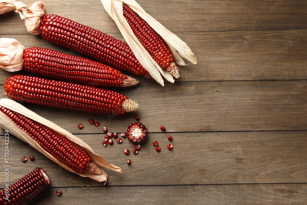 Ripe red corn cobs on wooden table, flat lay. Space for text