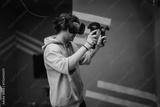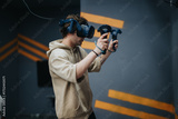 A young man immersed in a virtual reality gaming environment, using head-mounted gear and hand held controllers. Set in a contemporary indoor space, emphasizing interactive entertainment.