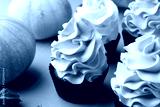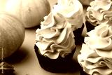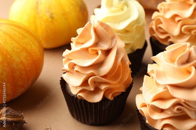 Delicious cupcakes with colorful cream and autumn decor on beige background, closeup