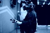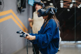 Friends engaging with virtual reality technology using controllers, wearing VR headsets, in a gaming setting with a lively and dynamic background, emphasizing technology and interactive entertainment.