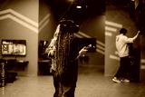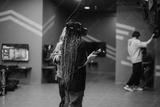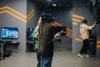 Friends gathered at a gaming center engaging with advanced VR technology, wearing headsets and controllers, immersed in a virtual experience.