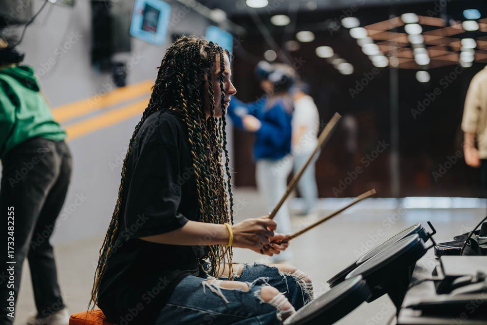 A young woman with stylish braided hair plays a drum kit during a lively gathering in a modern space with friends enjoying various activities.