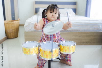 A cute little Asian girl is having fun playing a toy drum,baby girl play drum at home.