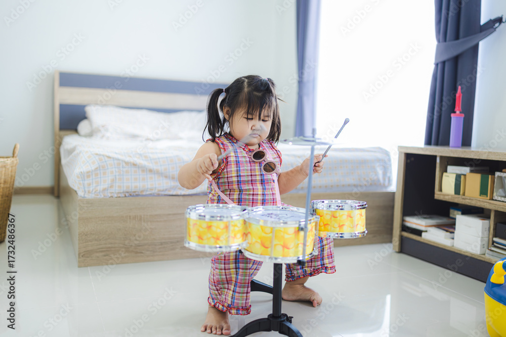 A cute little Asian girl is having fun playing a toy drum,baby girl play drum at home.