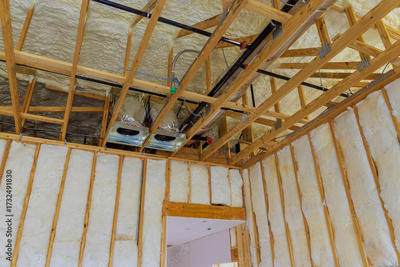 Exposed wooden framing with insulation, ductwork visible in residential construction indoors