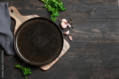 Empty black cast iron platter with herbs and garlic on wooden background
