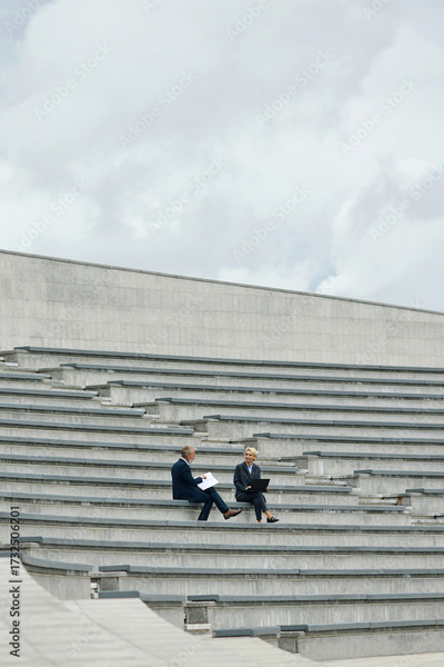 Caucasian middle aged man and mature woman sitting on outdoor concrete steps discussing documents, using laptop computer, both dressed in business attire, urban setting with cloudy sky