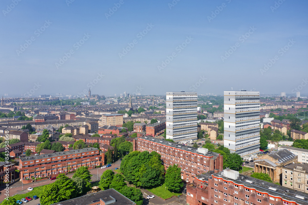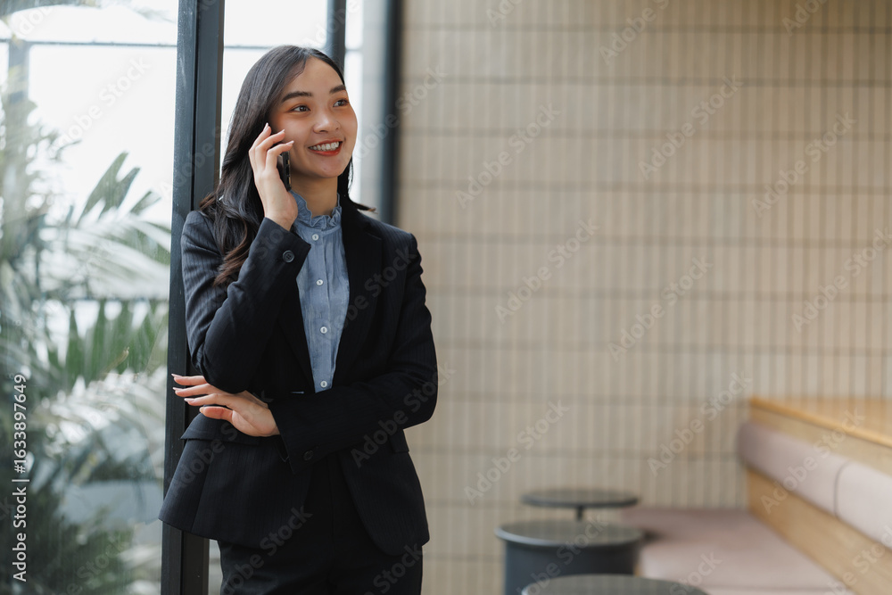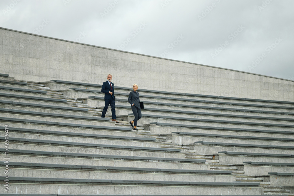 Two middle aged Caucasian male and female partners walking down wide concrete steps outdoors, both wearing business suits, overcast sky in background, urban setting emphasizing professional context