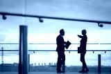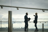 Middle aged Caucasian man and woman standing on outdoor terrace discussing business on office balcony or bridge, woman gesturing toward cityscape, both holding documents