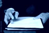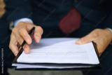 Hands of anonymous businessman holding clipboard and reviewing printed document with pen in hand, focusing on reading and analyzing paperwork during business or legal meeting outdoors