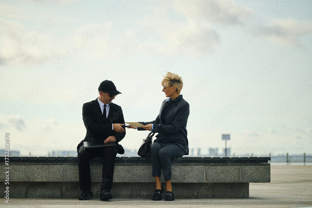 Middle aged Caucasian man in suit and cap handing document to mature woman with short blond hair sitting on outdoor bench, both focused on exchange, while discussing business issues