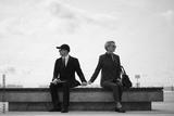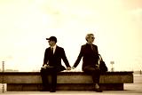 Caucasian young businessman and mature woman sitting on bench while facing away from each other, passing letter or document, both wearing business attire and sunglasses outdoors