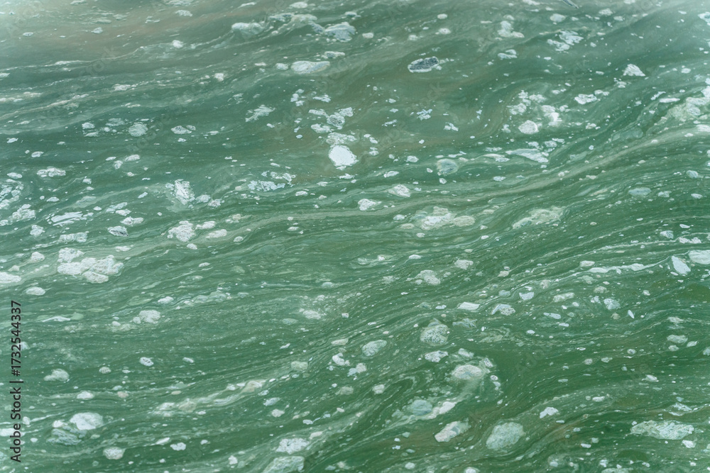 Foamy white streaks on the river, dirty muddy water with toxic emissions