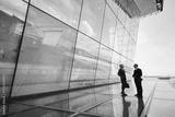 Caucasian middle aged businesswoman and businessman standing outside modern glass building, engaging in conversation on work issues, holding documents, cityscape reflected in windows