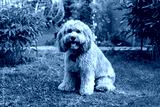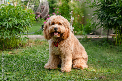 Close-up portrait of a brown curly-haired dog with a neat haircut, a breed of Kawapoo labradoodle in summer outside