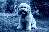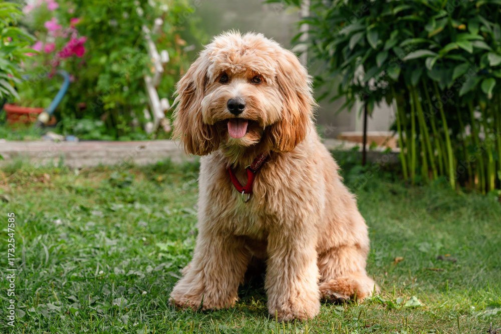 Close-up portrait of a brown curly-haired dog with a neat haircut, a breed of Kawapoo labradoodle in summer outside