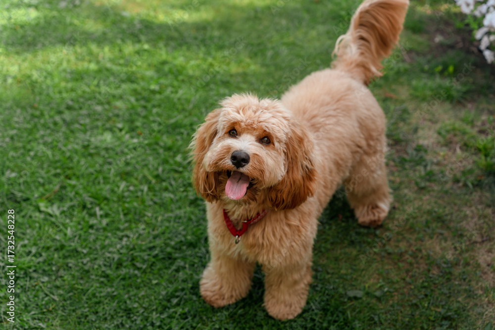 Close-up portrait of a brown curly-haired dog with a neat haircut, a breed of Kawapoo labradoodle in summer outside