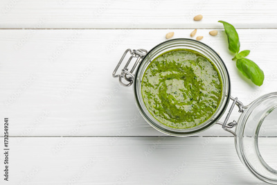 Tasty green pesto in glass jar, basil leaves and pine nuts on white wooden table, flat lay. Space for text