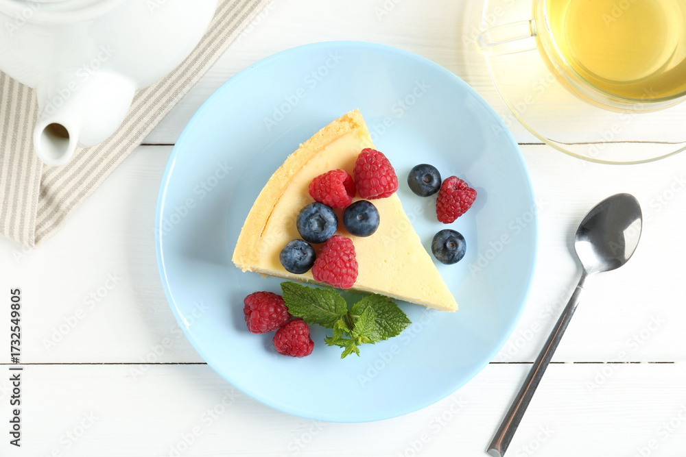 Piece of delicious cheesecake with fresh berries and mint served on white wooden table, flat lay