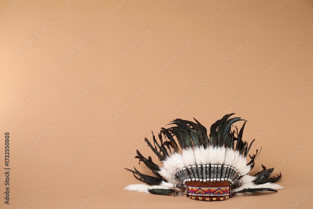 Traditional warbonnet (Native American chief headdress) on beige background, space for text