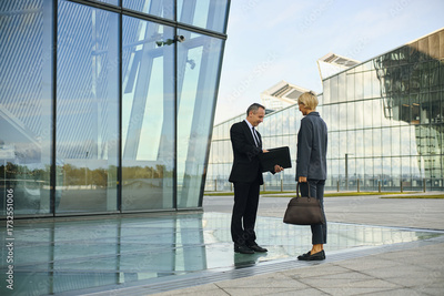 Middle aged Caucasian man shaking hands with female colleague outdoors in front of modern glass office building, both dressed in business attire, engaging in business meeting