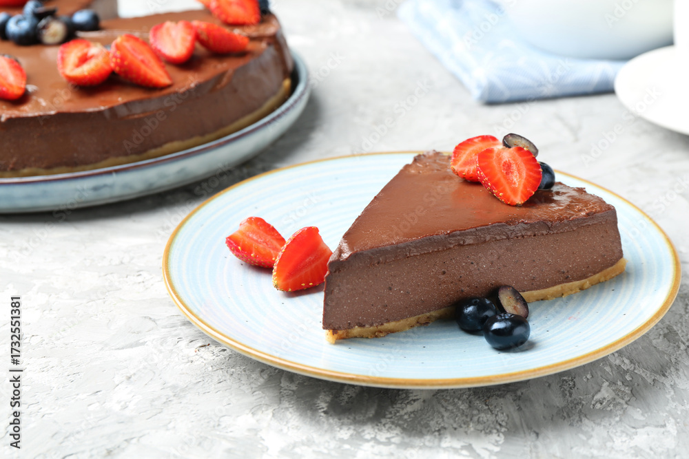 Piece of tasty chocolate cheesecake with berries on light grey textured table, closeup