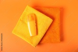 Fresh terry towels and cosmetic product on orange background, top view