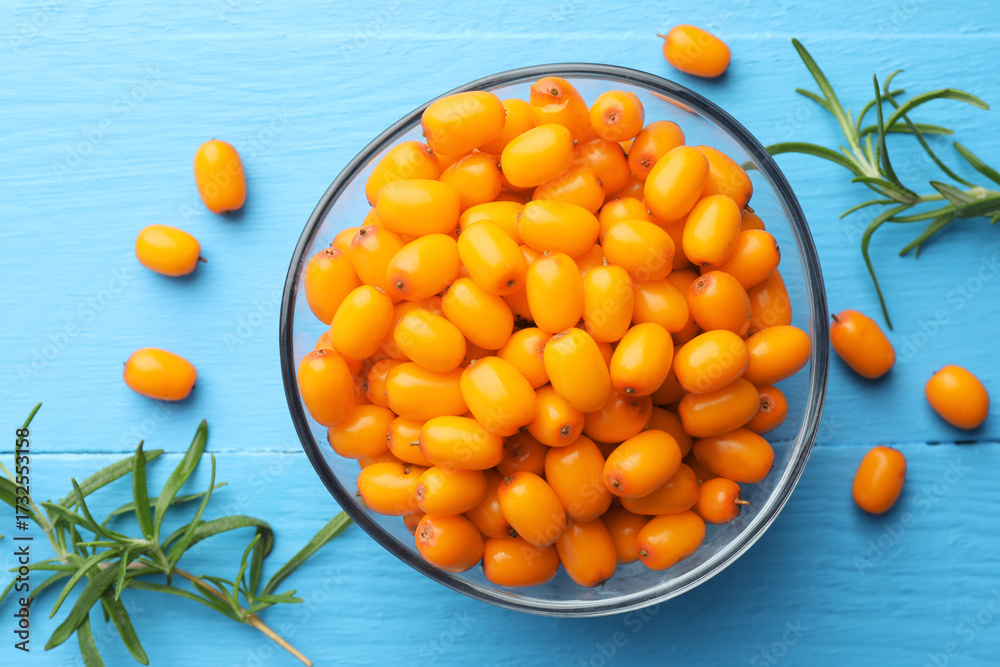 Fresh sea buckthorn berries in bowl and leaves on light blue wooden table, flat lay
