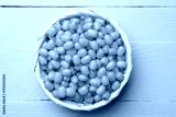 Fresh sea buckthorn berries in wicker bowl on light blue wooden table, closeup