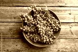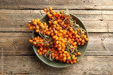 Fresh sea buckthorn berries with leaves in bowl on wooden table, top view