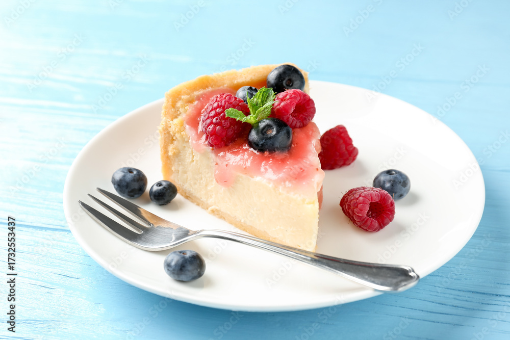 Piece of tasty cheesecake with berries and sauce on light blue wooden table, closeup