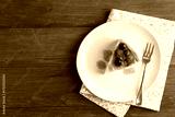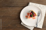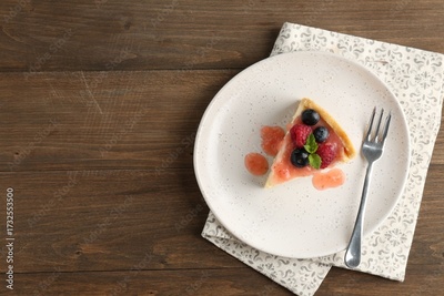 Piece of tasty cheesecake with berries and sauce on wooden table, top view. Space for text