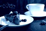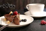 Piece of delicious chocolate cheesecake with nuts, berries and tea on black table, closeup