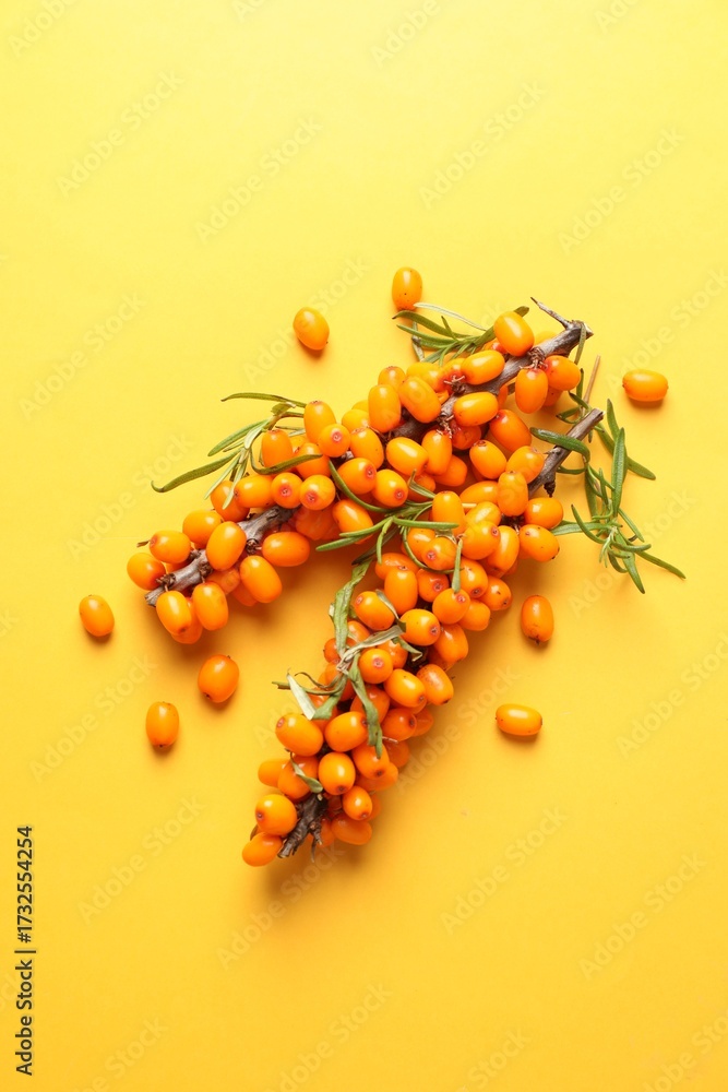 Branches with ripe sea buckthorn berries and leaves on yellow background, flat lay