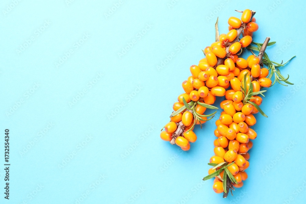 Branches with ripe sea buckthorn berries and leaves on light blue background, top view. Space for text