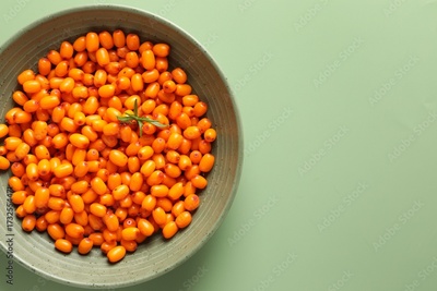 Ripe sea buckthorn berries and leaves in bowl on green background, top view. Space for text