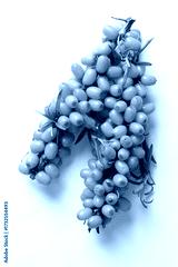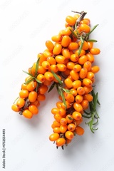 Branches with ripe sea buckthorn berries and leaves on white background, top view