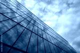 Modern glass building exterior reflecting blue sky and clouds, showing geometric architectural lines and contemporary urban design, upward perspective emphasizing structure height