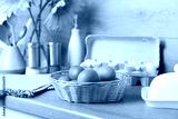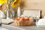 Raw chicken eggs, kitchen utensils and sunflowers on wooden countertop