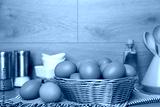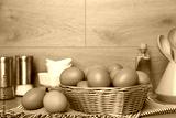 Raw chicken eggs in wicker basket and kitchen utensils on wooden countertop